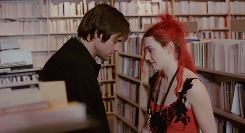 The way that they were able to take this idea and tell it in a non-linear fashion is quite remarkable; non-linear films don’t always have a good track record of success, and it takes a dedicated, smart, and capable crew to make it work. The way that they were also able to keep the viewers hooked and on track with Joel (Carrey’s character) traversing his memories with Clementine (Winslet’s character) was pretty astounding to me and kept impressing me as I was watching the movie. I think having a form of “meta” storytelling was fairly new to the film industry back in the late 90s and early 2000s, and Kaufman was quite burdened with it. In a 2004 interview with Script magazine, he mentioned how he was concerned with showing “the memories, Joel’s reactions to the memories, and Joel interacting with Clementine outside of the memories in the memories.” He was able to resolve this by having Joel be lucid and able to comment on his memories, but this concept still seems pretty ahead of its time to me for 2004. Speaking of which – the special effects for this movie also felt quite ahead of their time for what they were able to accomplish. I liken a lot of the scenes where Joel’s memories are being erased to the “dreams collapsing” sequences in Inception: the world around them is slowly disappearing or falling apart, but the protagonist is trying their hardest to stay in that world and keep those with them alive in it. Inception takes quite a different path with its grandiosity and more violent nature, but Eternal Sunshine is much more minimal and involves things like a house slowly collapsing around them or the color on books fading away. It was beautiful throughout and never felt “of its time” or outdated in any way.